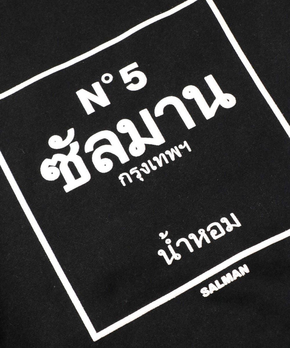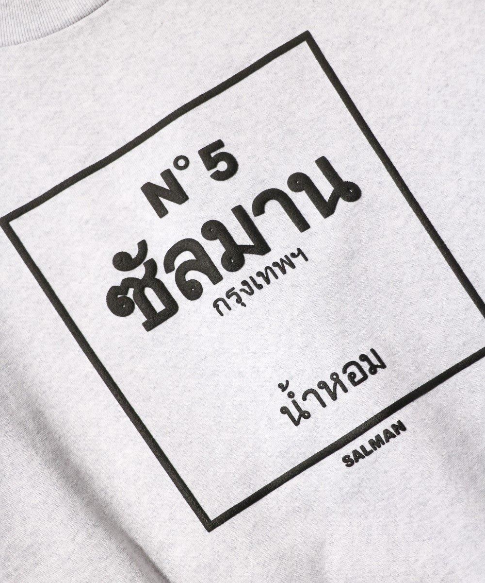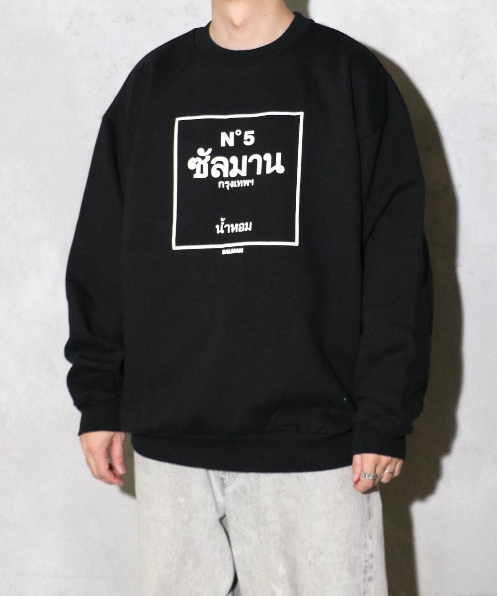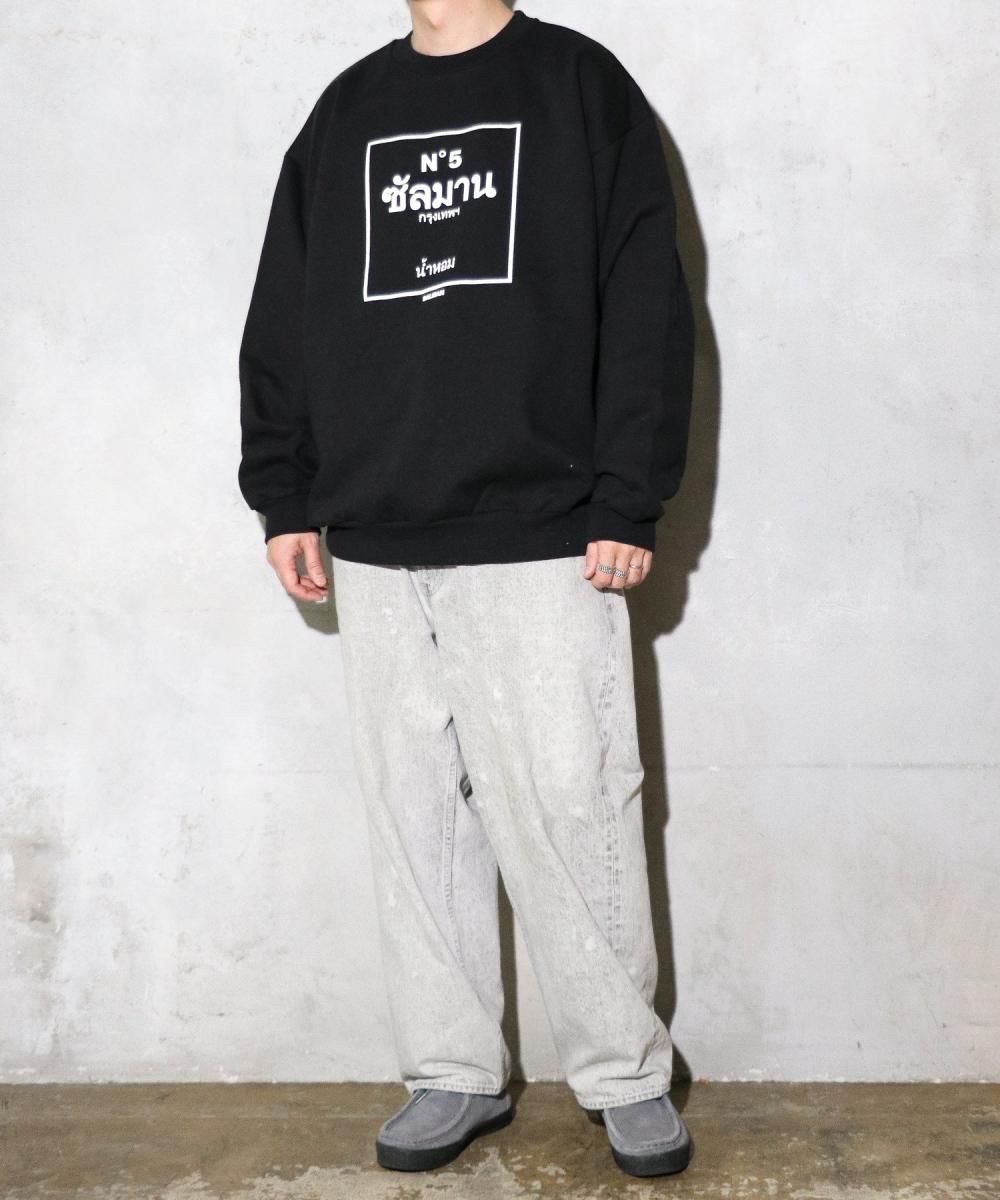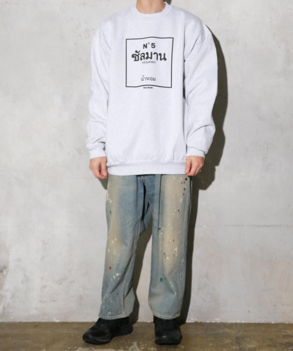 誰もが知るオードパルファム「NO.5」をタイ語でオマージュした発泡プリントを前面に施した裏起毛クルーネックスウェット。