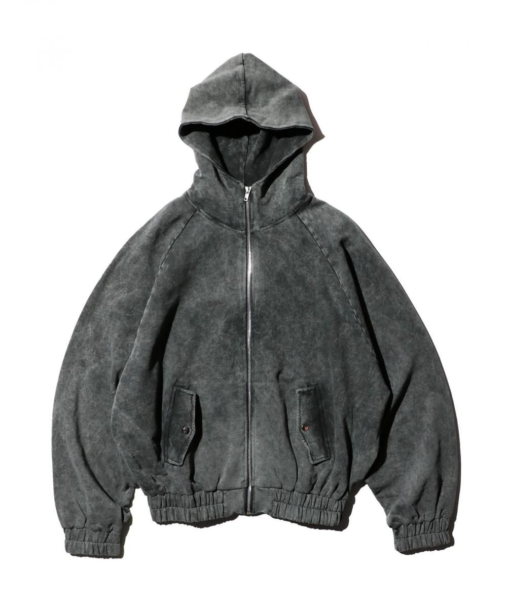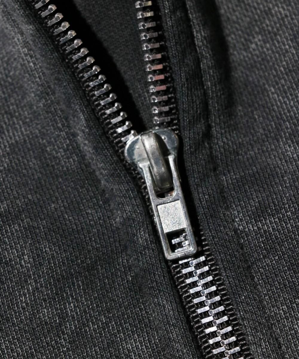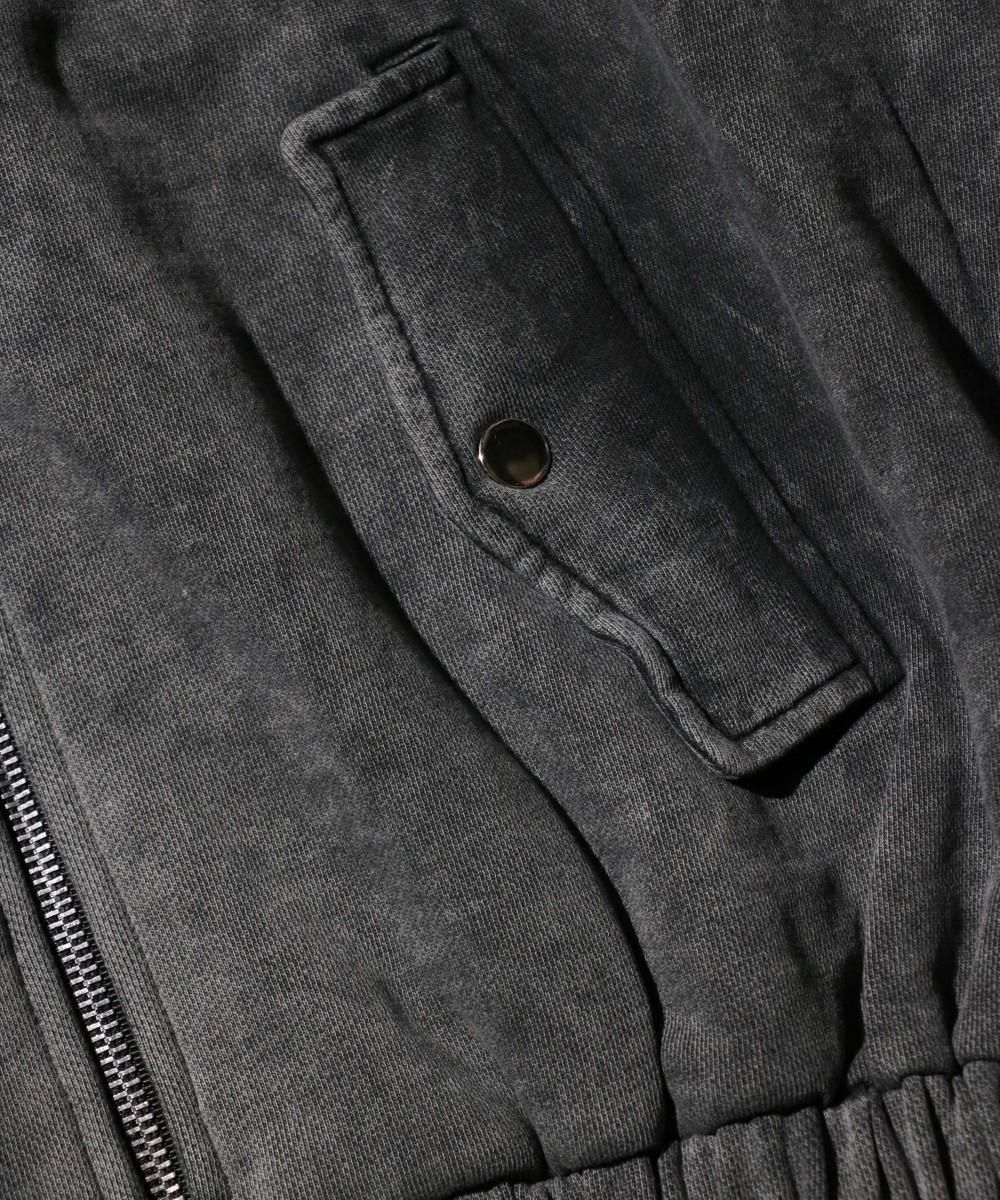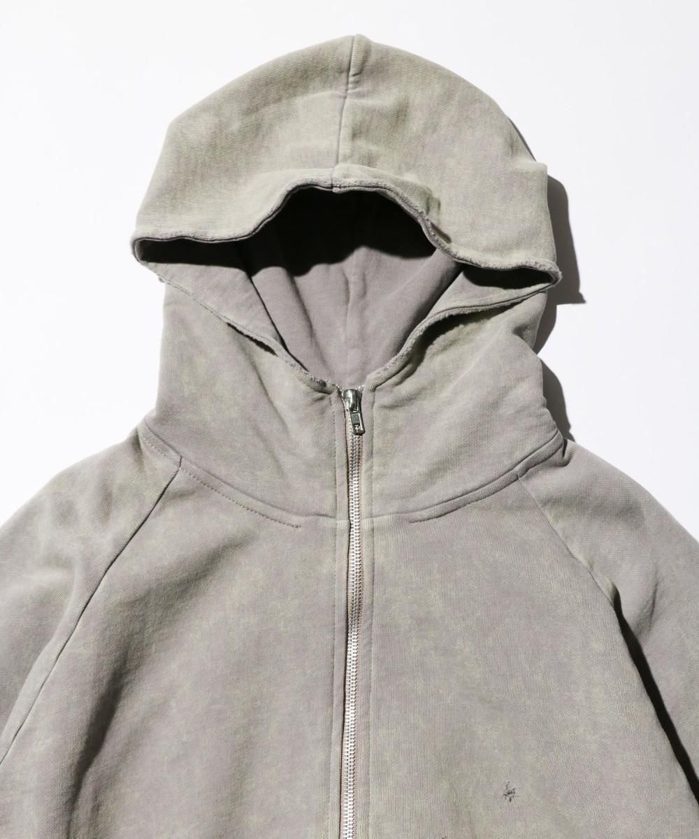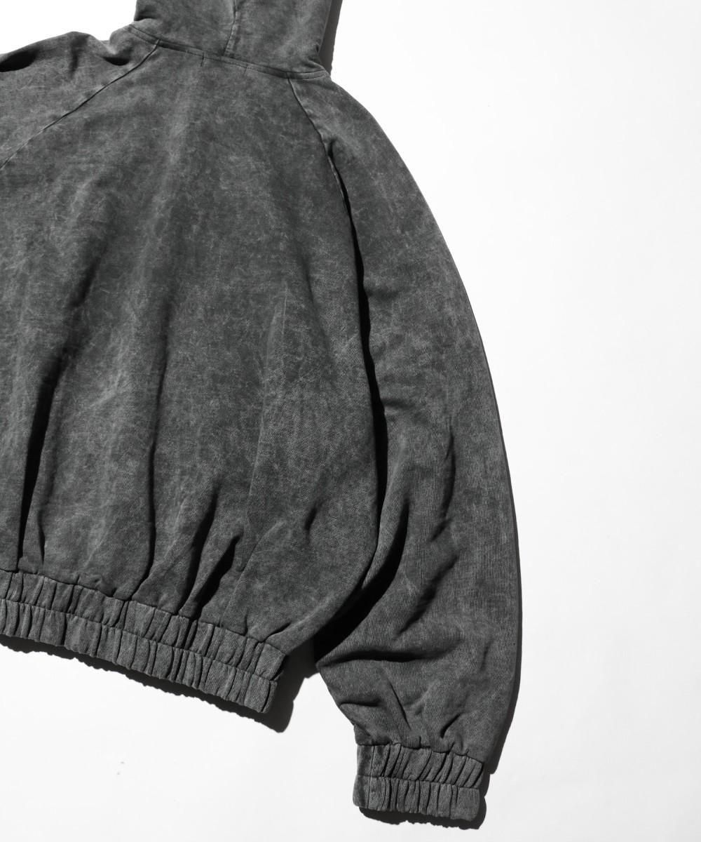 ウォッシュ加工が施されたジップフーディー。