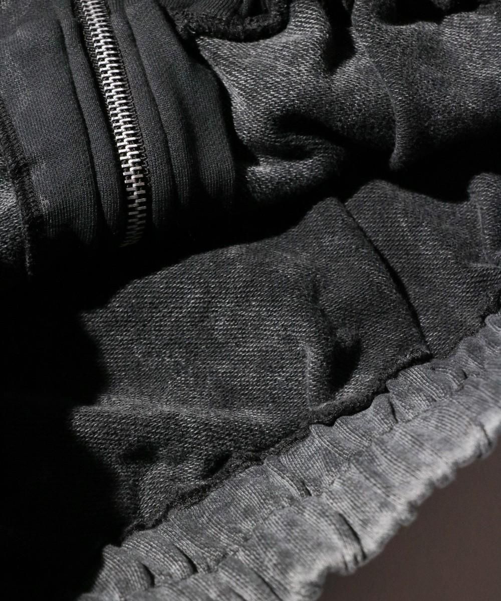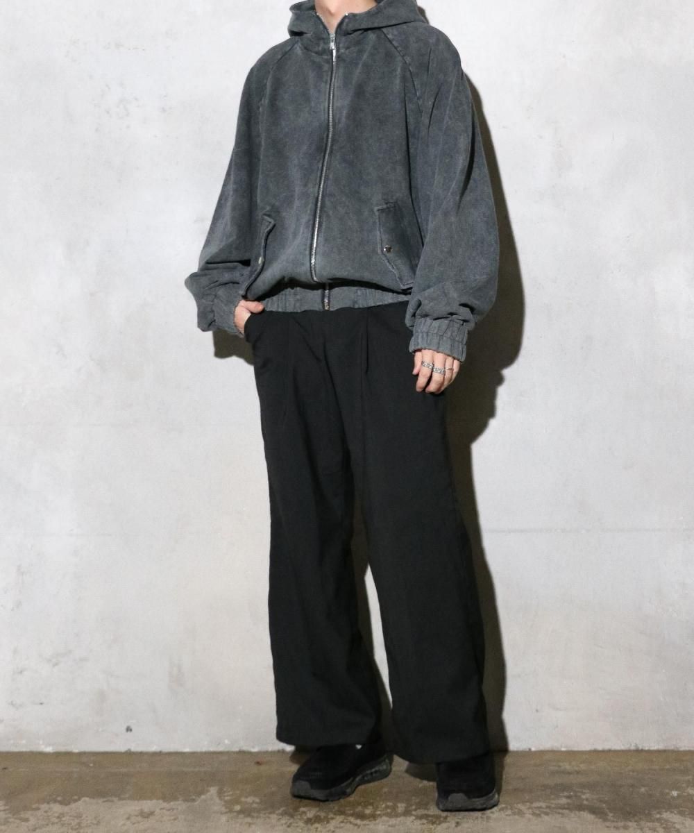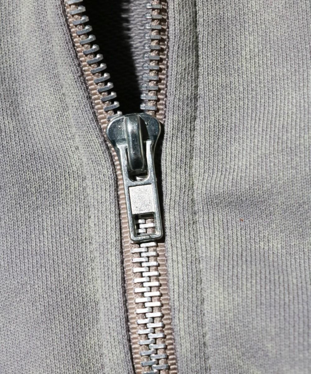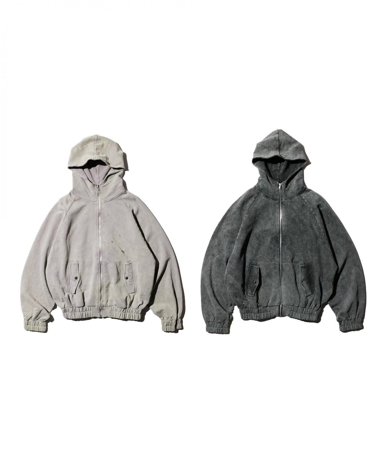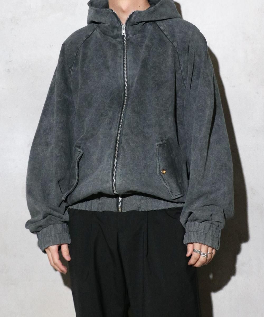 ウォッシュ加工が施されたジップフーディー。