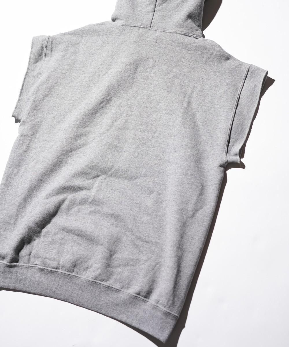 カットオフでノースリーブに仕上げたフットボールプリントのプルオーバーパーカー。