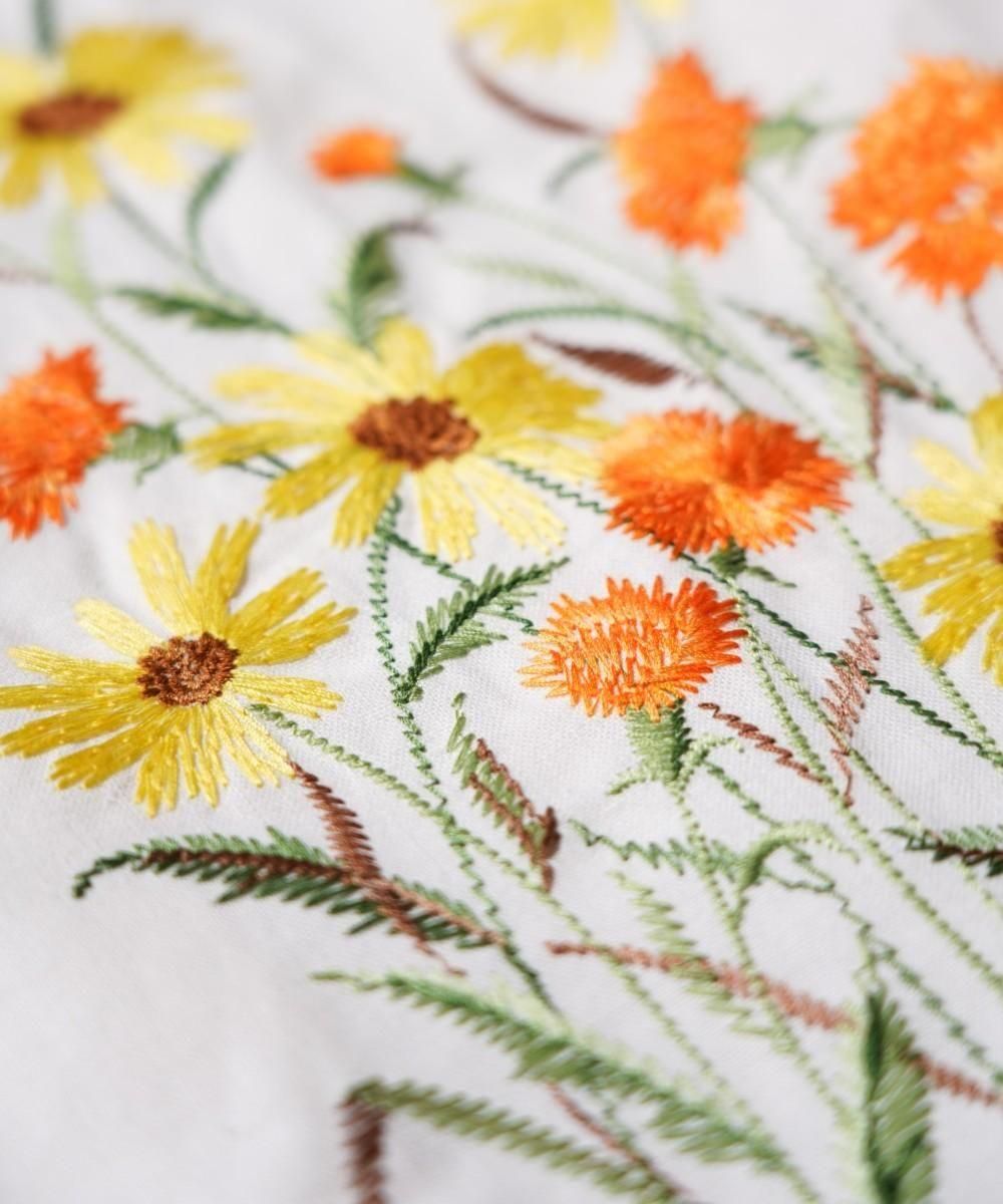 ボックスシルエットのゆったりしたサイズ感、裾脇はスリット仕様、フロントには貝ボタンを使用し、花畑をイメージした、刺繍を施し、インパクトのある仕上がり。