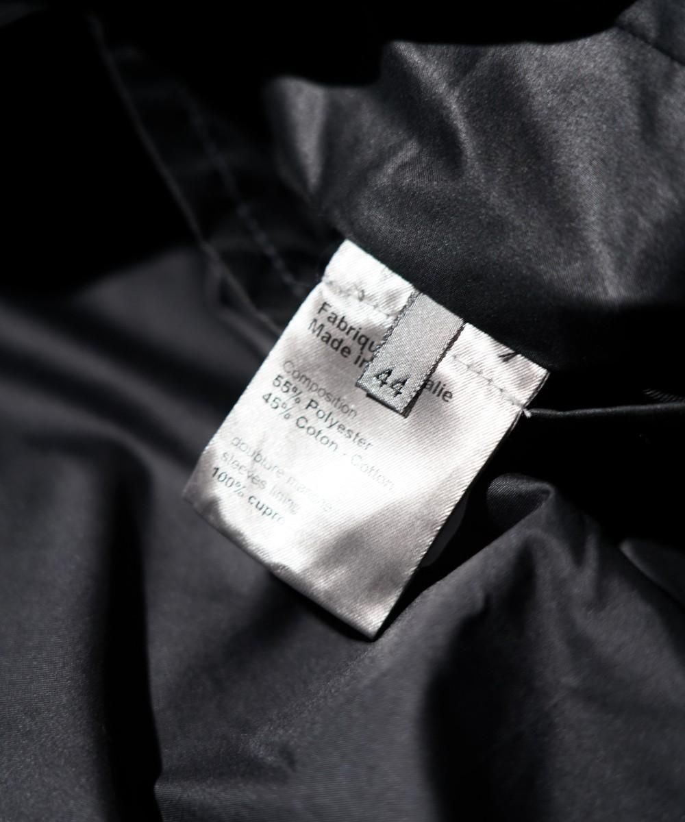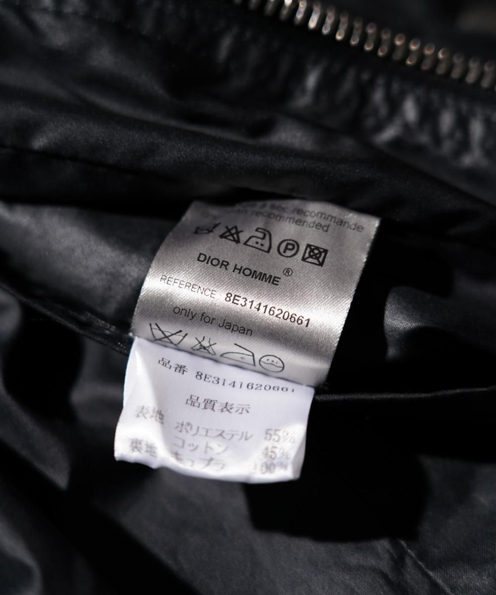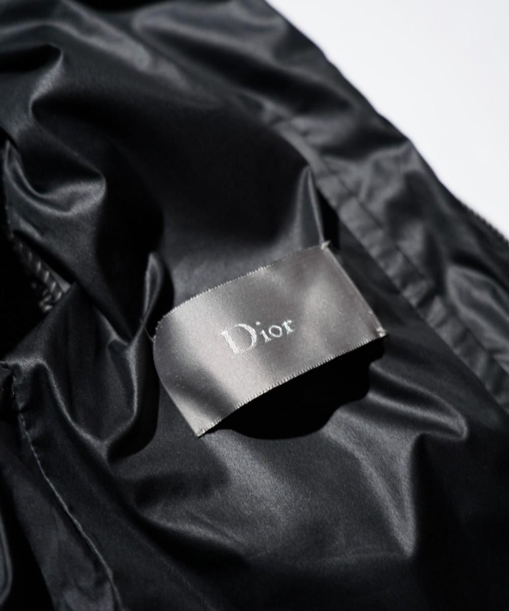 DIOR 2008年春夏コレクション、クリス・ヴァン・アッシュが手がけたジップアップストームジャケット。マットで光沢のある独特な素材を使用し、モダンなマウンテンパーカースタイルを表現しています。フロントは機能的なスナップボタンとダブルジップ仕様で、着脱がスムーズ。前面および袖部分にはフラップポケットを配し、実用性とデザイン性を両立。背面にはDIOR HOMMEの象徴であるダーツが入り、立体感を強調するとともに、テクニカルなステッチが精緻なディテールを演出しています。素材はポリエステル55%、コットン45%の混紡で、耐久性と快適な着心地を実現。アウトドアの機能美と洗練されたモード感が融合した、クリス期ならではの洗練された一着です。