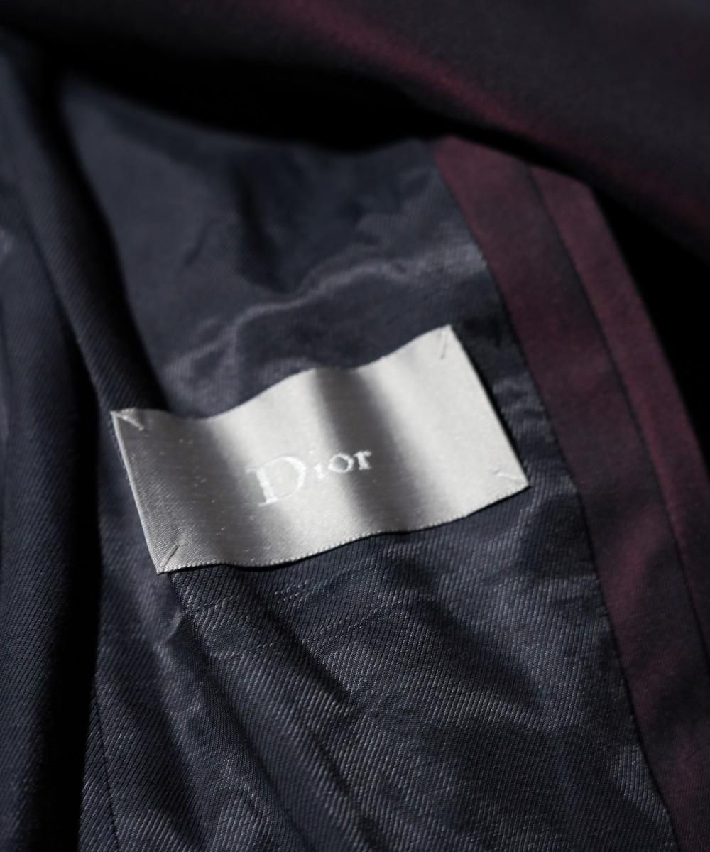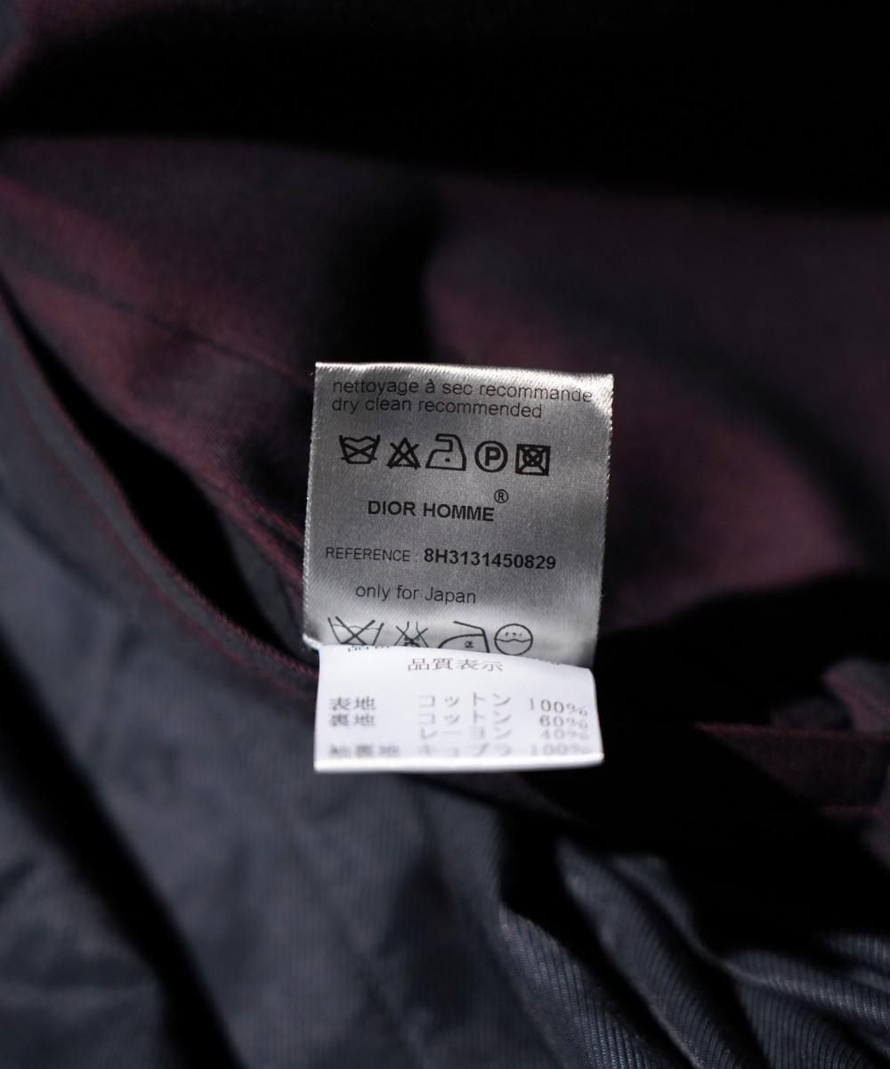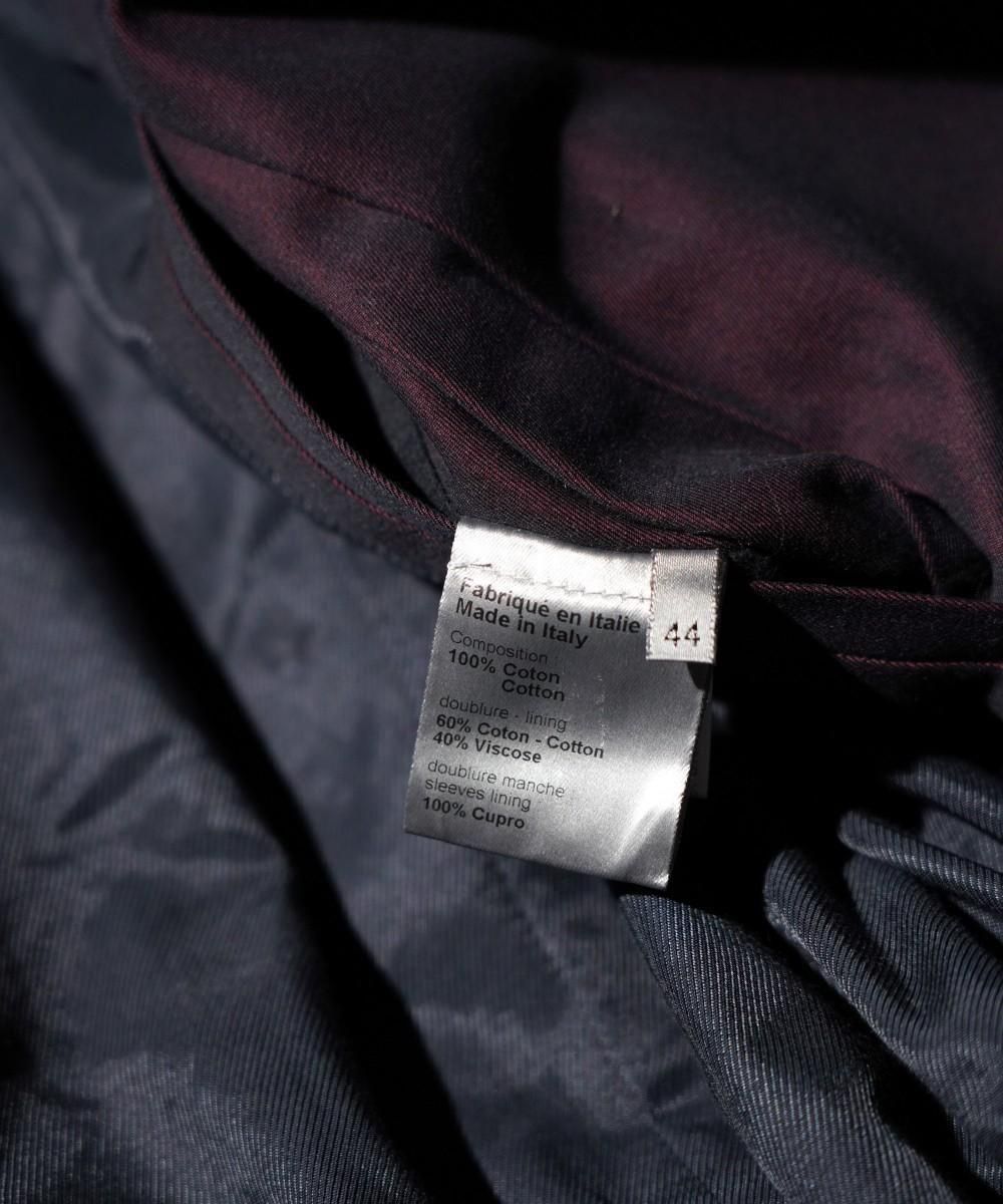 DIOR 2008年秋冬コレクションより、クリス・ヴァン・アッシュが手がけたバーガンディのトレンチコート。深みのある玉虫色のバーガンディが上品で洗練された存在感を放つ一着です。クラシカルなトレンチコートの構造を踏襲しながらも、エポレットや袖の深いボタンホール、直線的なカッティングなど、モードなエッセンスが随所に盛り込まれています。ボタンには「DIOR HOMME」の刻印が施され、細部までブランドのこだわりが感じられます。同色のウエストベルトがシルエットの調整と引き締めを可能にし、ひじ部分にはダーツを入れることで自然な立体感を演出。背面にはディオールオムの象徴ともいえるダーツと、首元から裾まで続くプリーツが施され、構築的かつドラマティックなバックスタイルを形成します。タイムレスな中に鋭い感性が光る名品です。