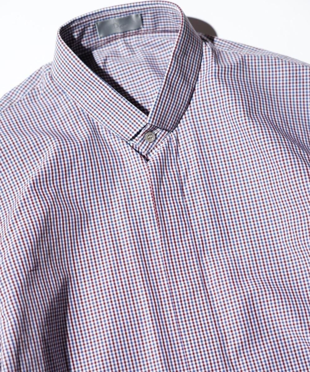 OLD / DIOR HOMME BAND COLLAR TRICOLOR MICRO-CHECK CONCEALED PLACKET LONG SLEEVE SHIRT