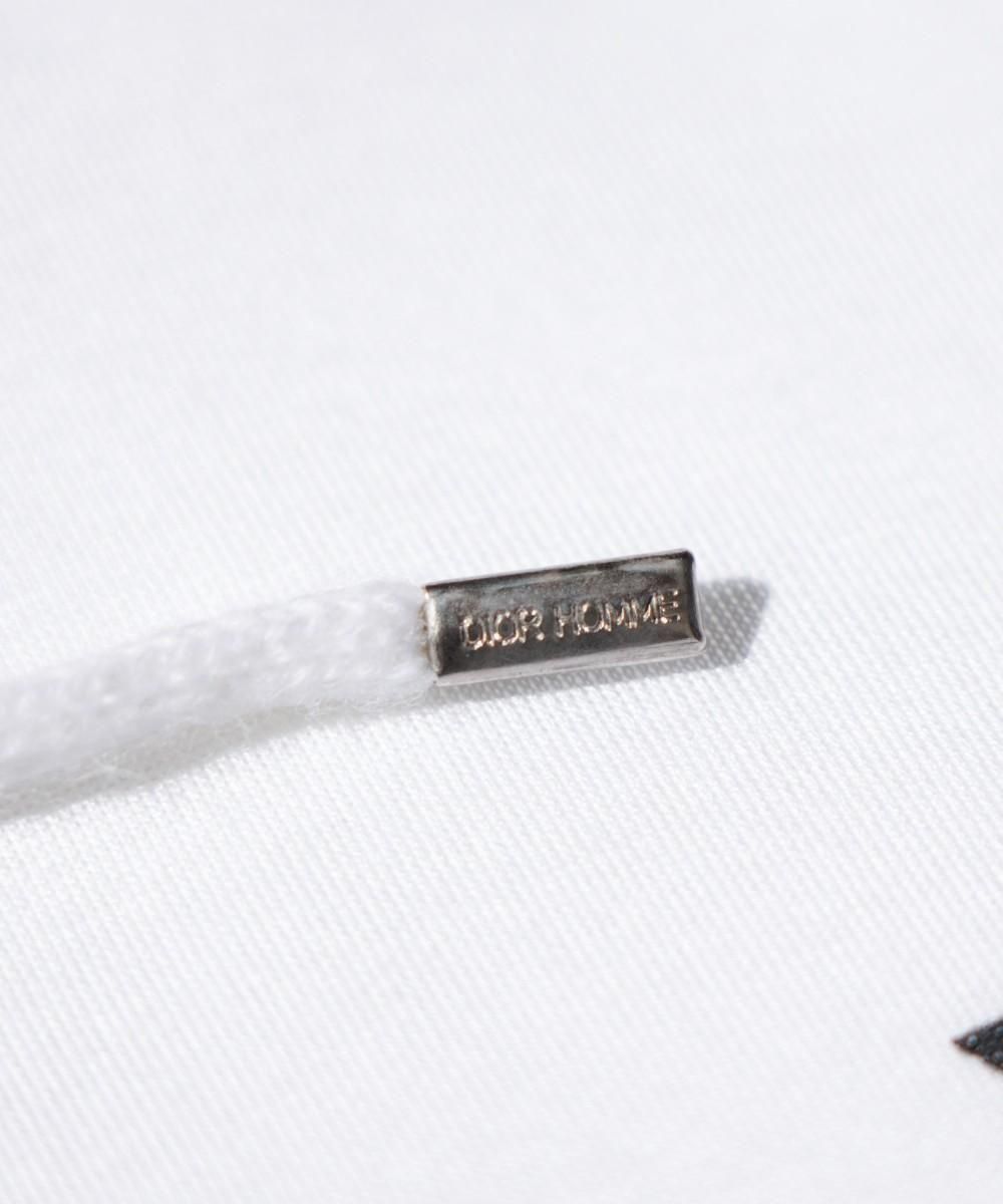 DIOR HOMME 2009年春夏コレクションより、クリス・ヴァン・アッシュが手がけたロング丈カットパーカー。Tシャツのようなライトなカットソー生地を使用し、滑らかで光沢感のある上質なコットン素材が特徴。フードにはドローコードが付き、先端には“DIOR HOMME”の刻印が施された金属パーツを採用。シャツのようにラウンドした裾と、リラックスしながらも洗練されたロングシルエットが絶妙なバランスを演出する。カジュアルさの中にモードなエッセンスを感じさせる1着。