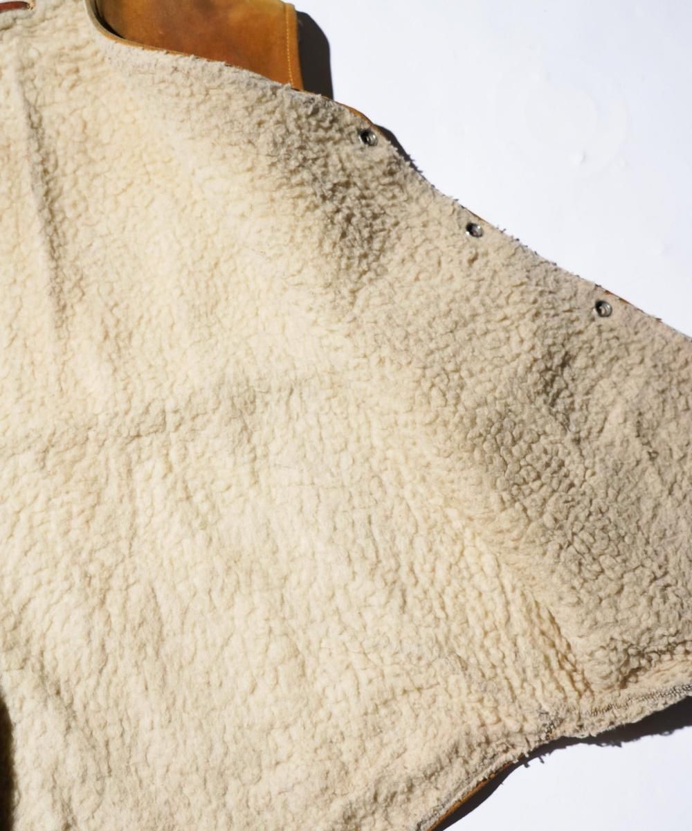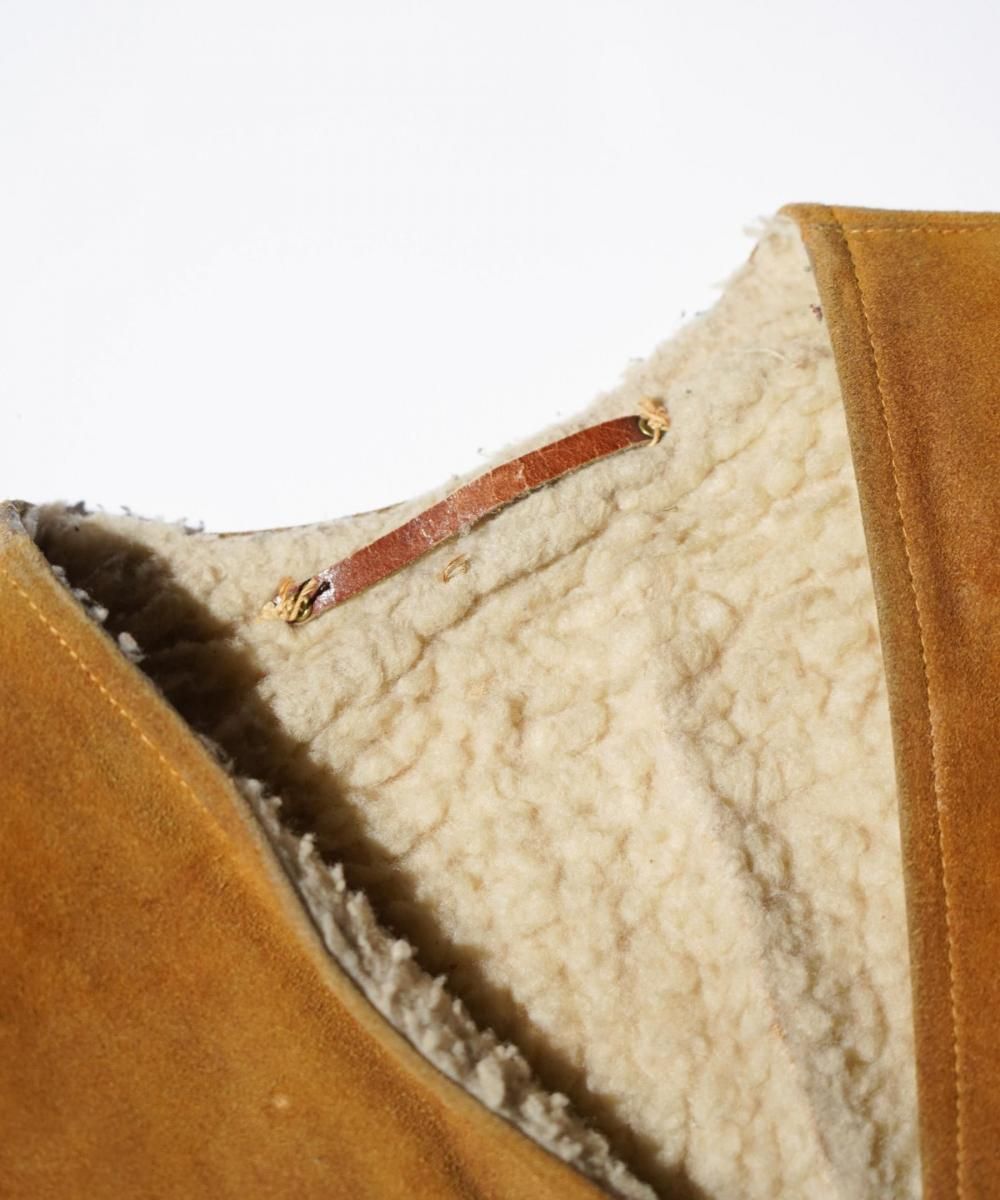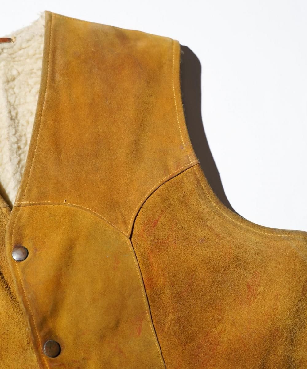 1960〜70年代頃のアメリカ製と思われる、ブランドタグのないシープスキンベスト。厚みのあるスエードレザーに、裏地は天然のムートンを使用し、高い保温性と着心地を両立。ウエスタン調のヨーク切り替えや、両裾のフラップポケット、スナップボタン仕様など、当時のワーク&アウトドアウェアに見られる無骨なディテールが魅力。経年による風合いも唯一無二の存在感を放ちます。