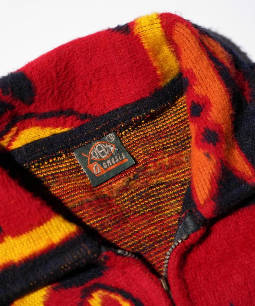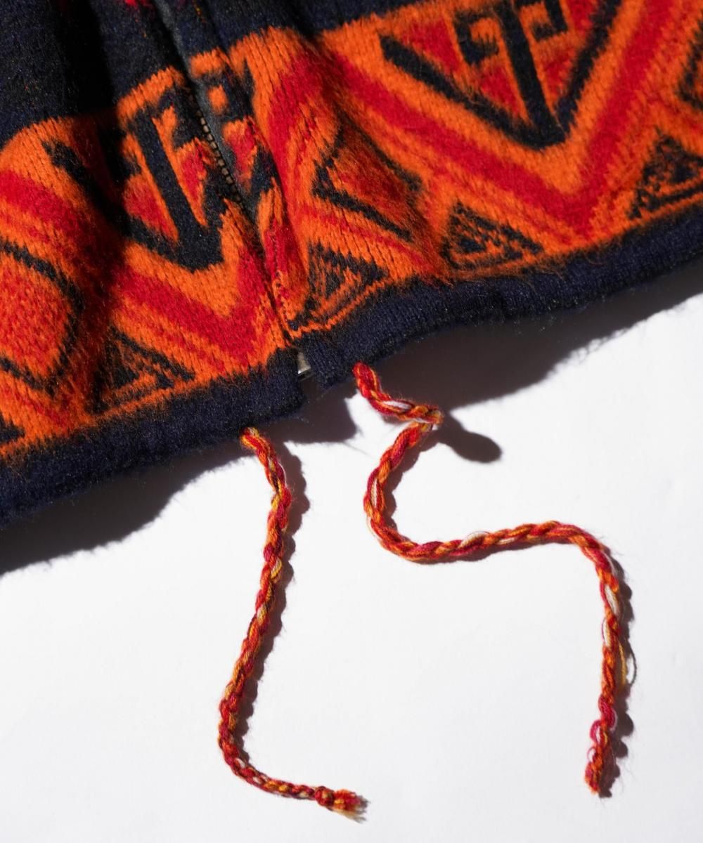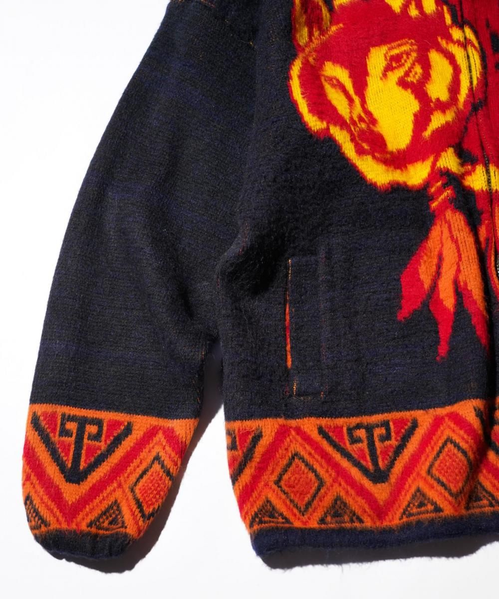 1990年代にエクアドルで製造されたウールジップアップセーター。フロントに大きく描かれたウルフとドリームキャッチャーのモチーフが印象的で、ネイティブアメリカンカルチャーを感じさせる一着です。ニット特有の温もりある仕上がりと肉厚なウール素材が魅力で、見た目のインパクトと防寒性を兼備。唯一無二の存在感を放つヴィンテージアイテムです。