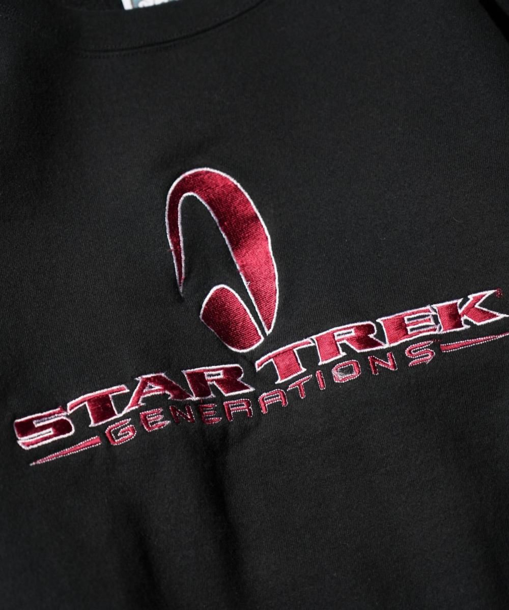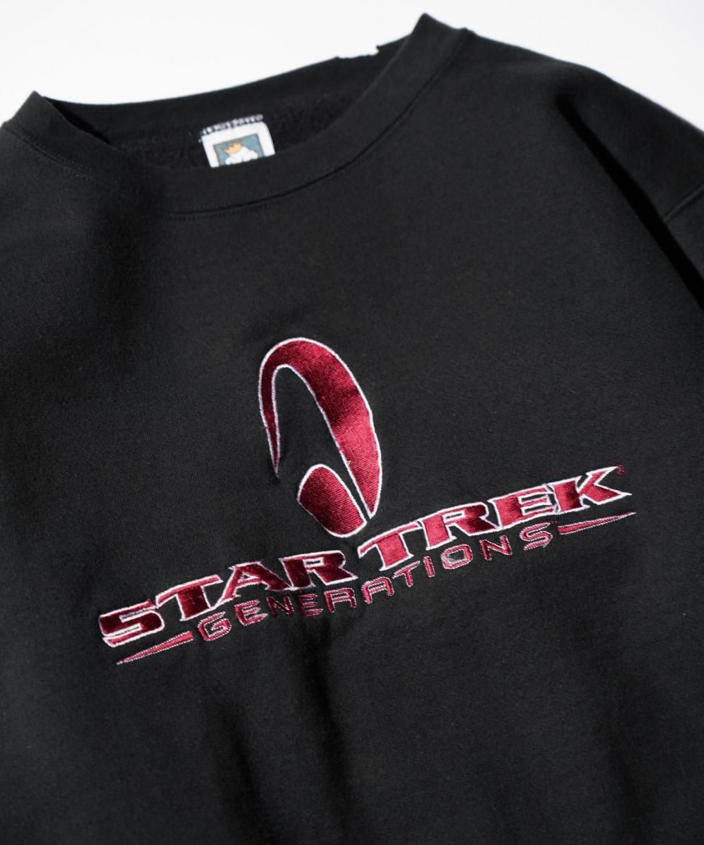 「STAR TREK GENERATIONS」の刺繍が施されたスウェットは、1994年に公開された映画『スター・トレック ジェネレーションズ』のアイテムとして製作された製品です。 この映画は、オリジナルシリーズのキャプテン・カークと『新スタートレック』のキャプテン・ピカードが共演することで話題となり、ファンの間で大きな注目を集めました。スウェットのデザインには、映画のロゴや象徴的なアイコンが刺繍されており、映画公開当時のプロモーション活動の一環として制作されたと考えられます。 素材には、コットンとポリエステルの混紡が使用されており、耐久性と快適性を兼ね備えています。現在ではコレクターズアイテムとしての価値があると考えられます。