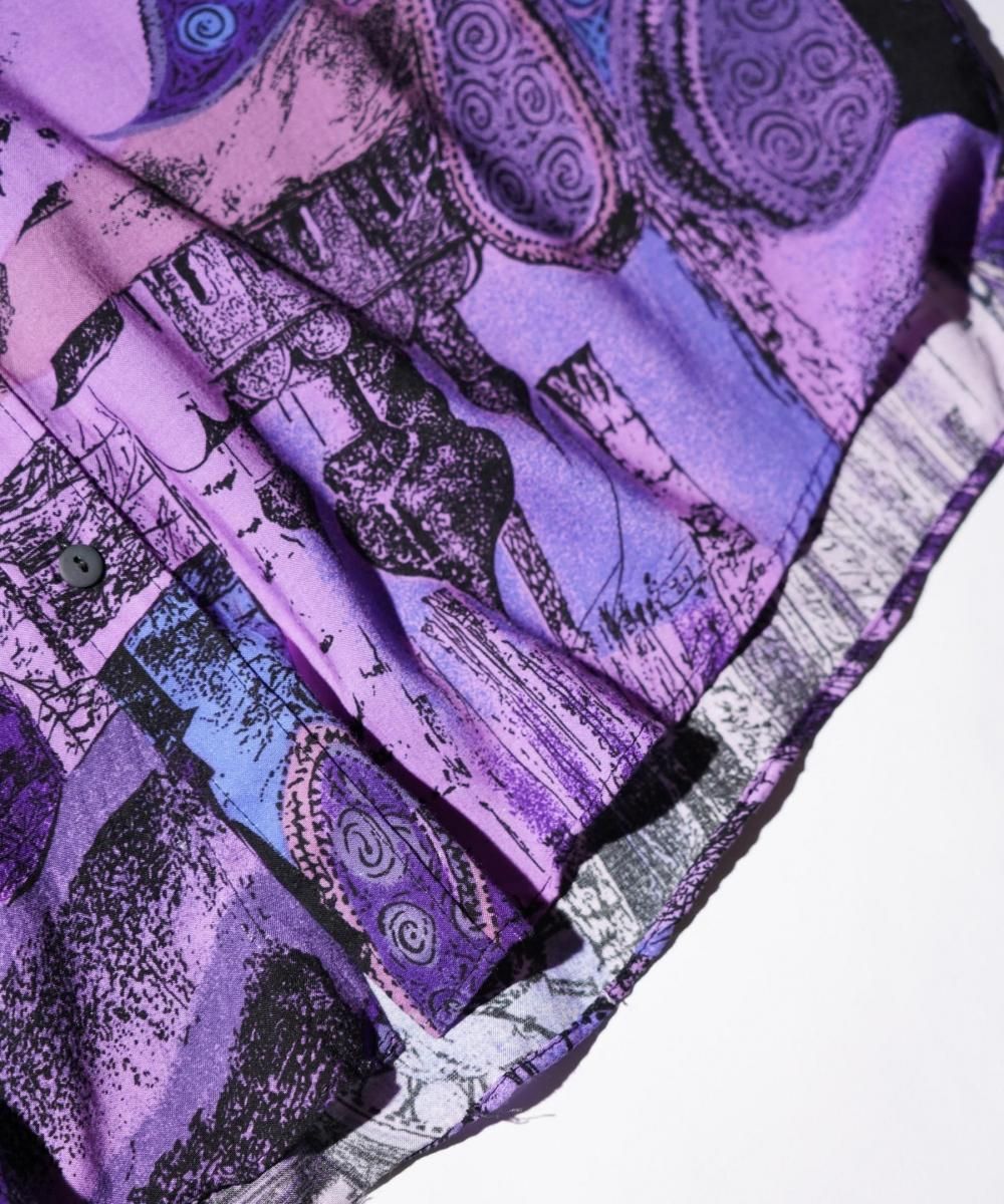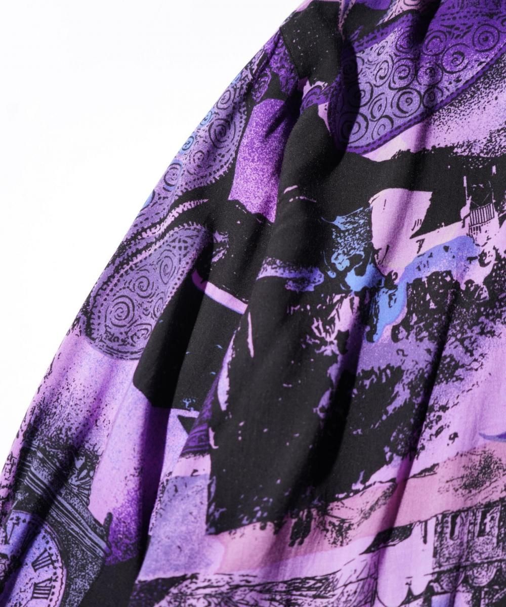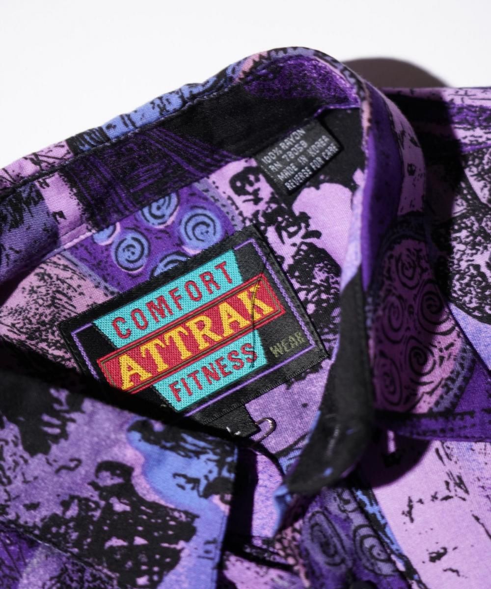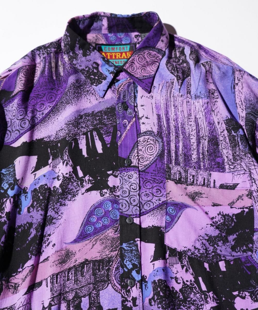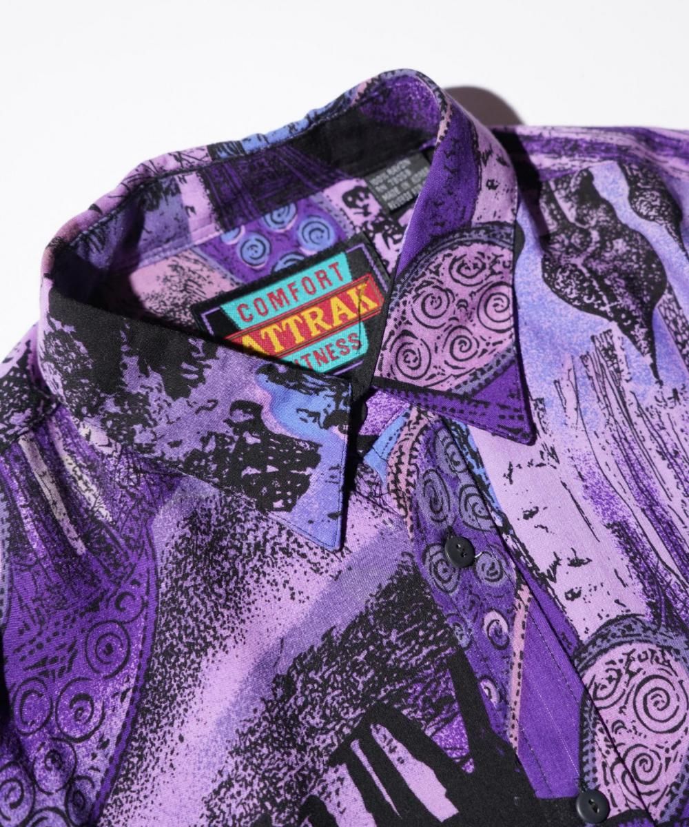 COMFORT ATTRAK FITNESSによる90年代頃のヴィンテージ長袖シャツ。全面に人物や風景写真をモチーフにした総柄プリントが施され、グラフィカルで視線を惹きつけるデザインが特徴です。素材はレーヨン100%で、とろみのある滑らかな肌触りとリラックス感のある着心地が魅力。ゆったりとしたシルエットで、都会的なアート感とリゾートの軽やかさを併せ持つ一枚です。
