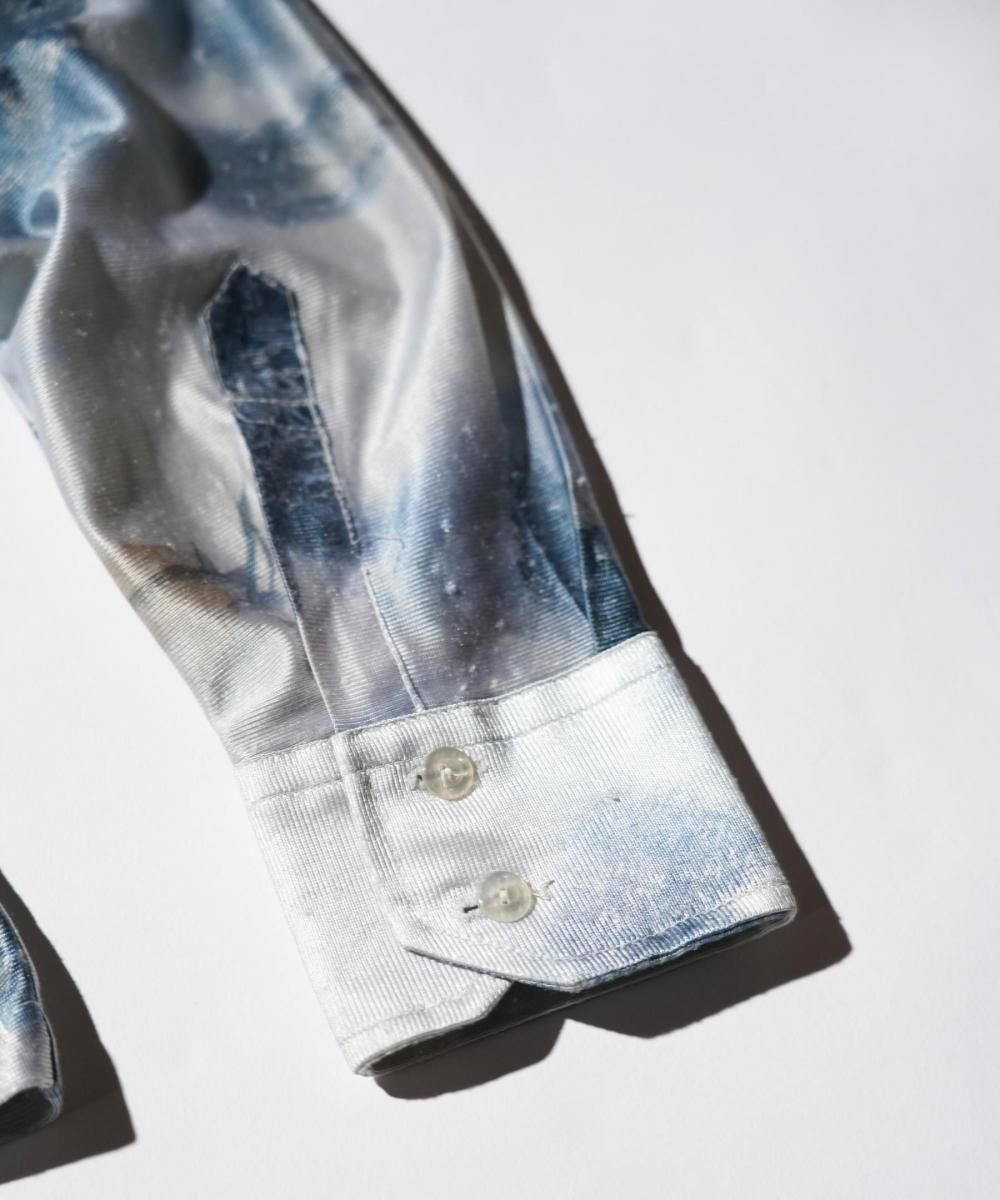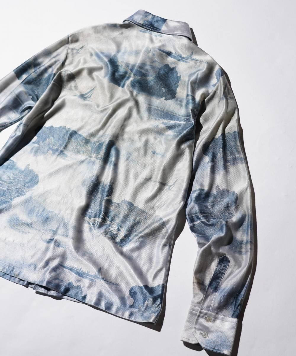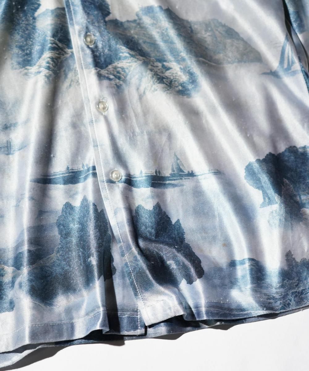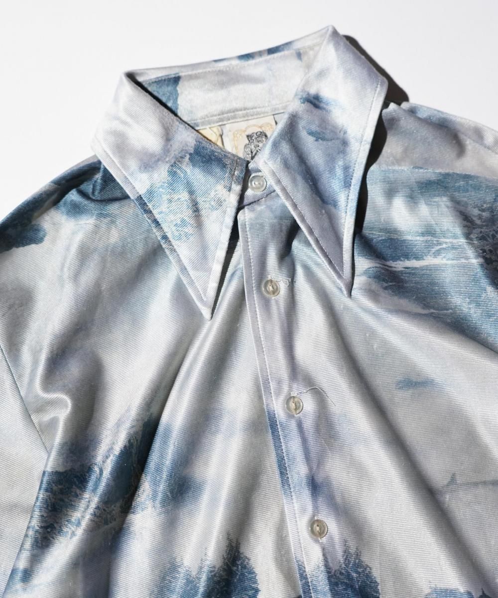 1970年代製と思われるロングスリーブシャツ。前立てのないミニマルなフロントに、ロングポイントカラーを採用した当時らしいデザインが特徴です。素材はおそらくポリエステルで、さらりとした肌触り。全体に広がる“Misty Mountain Landscape”――霧がかった野山の風景を写実的に描いたプリントが印象的で、どこか幻想的なムードを漂わせます。静謐な自然美を纏うヴィンテージピース。