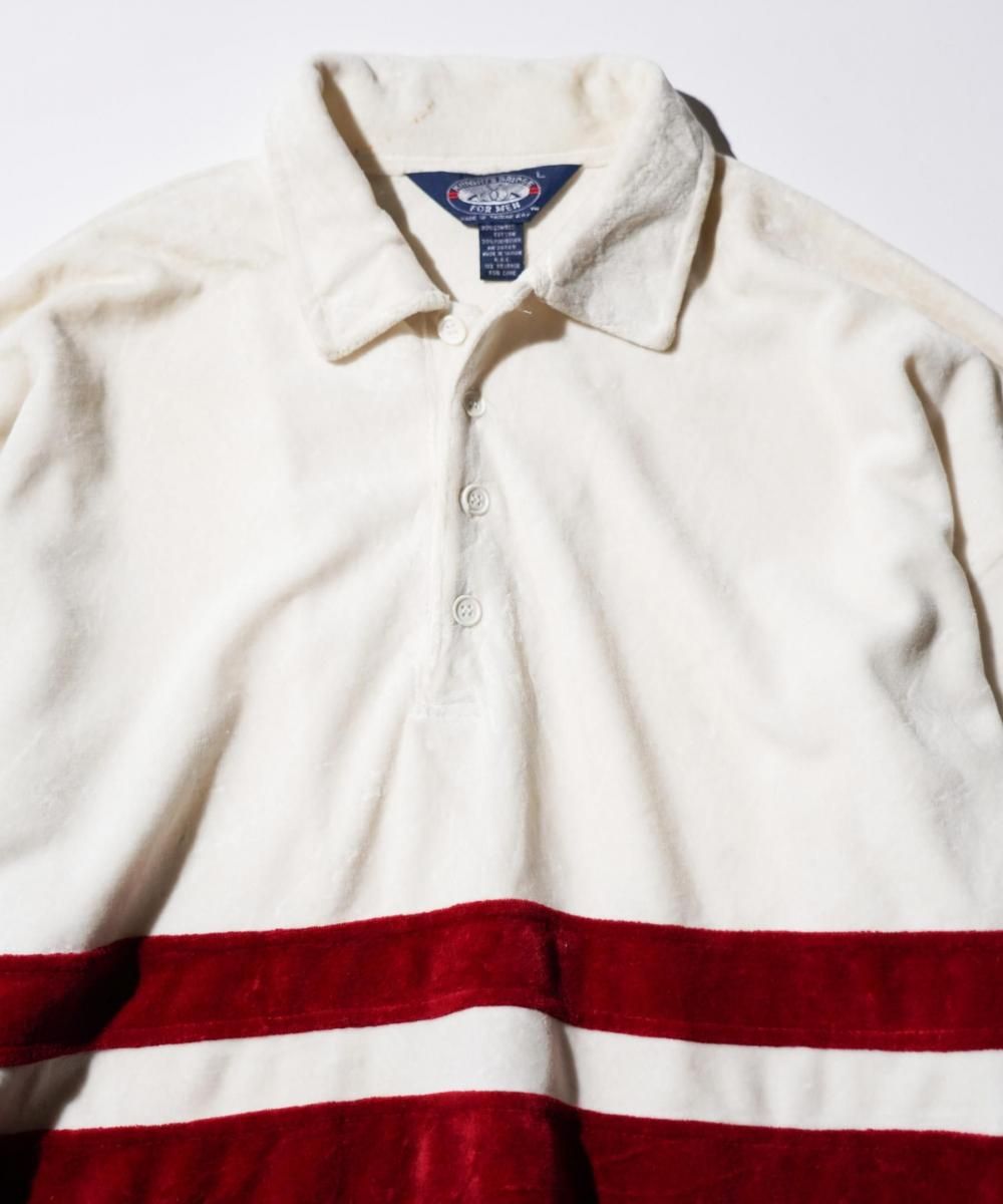 90年代の空気感を纏った、KNIGHT BRIDGEの長袖ポロシャツです。上質なベロア素材を贅沢に使用し、柔らかなオフホワイトをベースに、胸元の鮮やかなレッド、そして裾と袖口のシックなネイビーの3色で大胆に切り替えられたデザインが、個性的なコントラストを生み出しています。襟付きのハーフボタンタイプで、カジュアルながらもどこか上品な印象を与えます。ゆったりとしたシルエットは、リラックスした雰囲気で、大人のカジュアルスタイルにぴったり。 独特なカラーブロッキングと、ベロアの素材感が際立つ一点。個性的なファッションを楽しみたい方や、90年代スタイルがお好きな方におすすめのアイテムです。