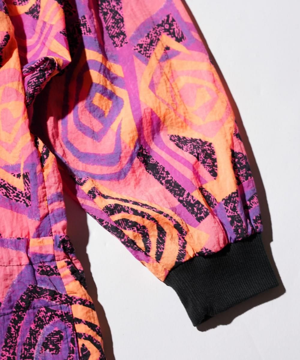 鮮やかなピンクとオレンジ、パープルが織りなす大胆な幾何学模様が目を惹く、Reebokのプルオーバーナイロンアノラックです。このデザインは、1980年代後半から1990年代初頭にかけてReebokが展開していた「STEP Reebok」ラインのもので、当時のフィットネスやストリートファッションのトレンドを色濃く反映しています。 軽量で耐久性のあるナイロン100%素材は、機能性と快適性を両立。フロントのハーフジップと、裾に配されたドローコードにより、シルエットの調整も可能です。フード付きで、急な天候変化にも対応する機能性も兼ね備えています。