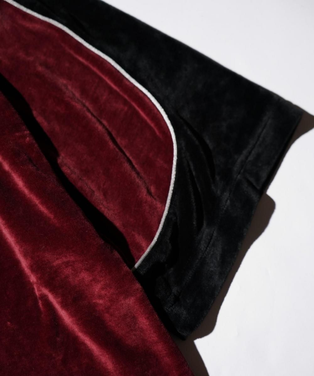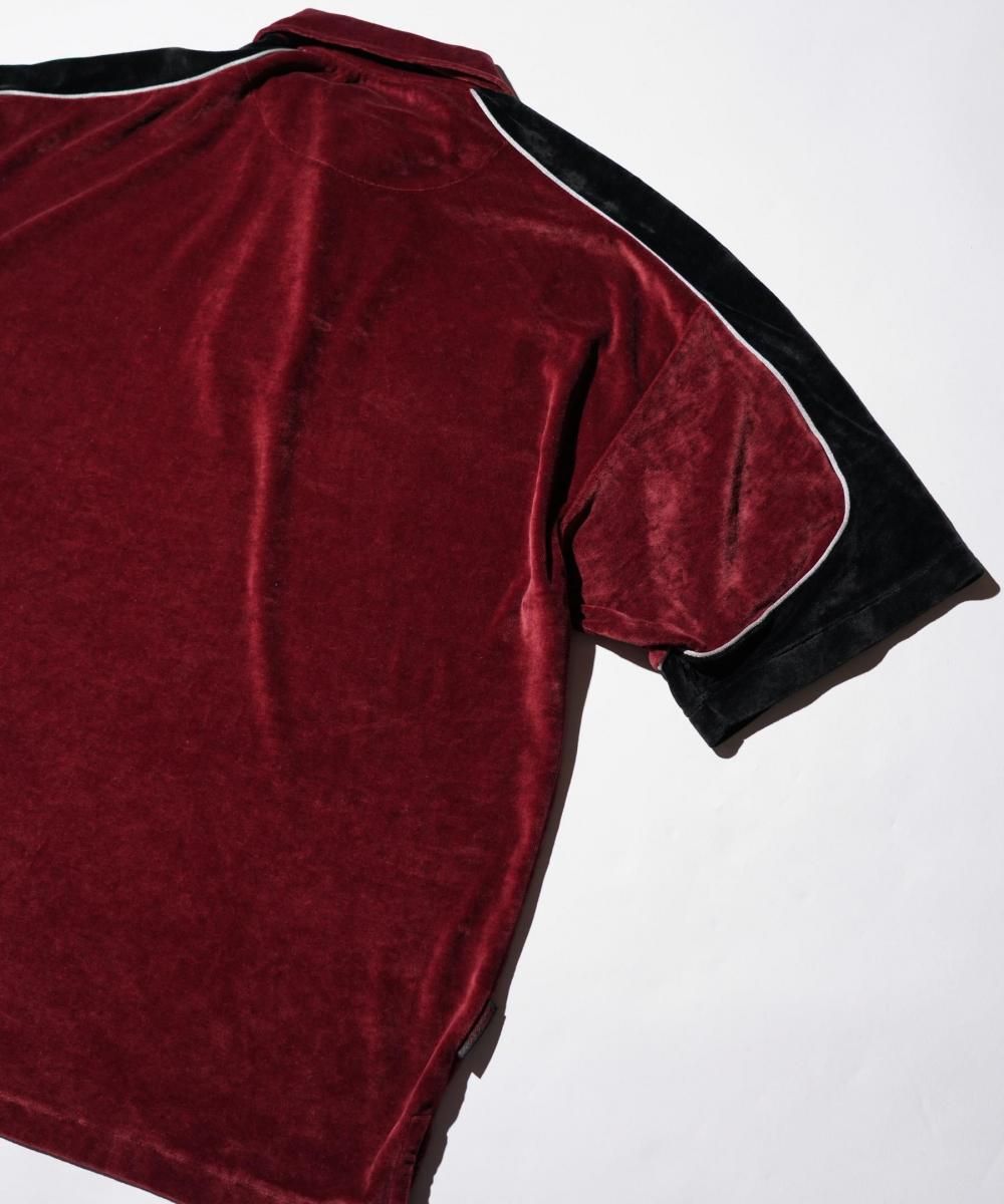 このポロシャツは、タグの表記やデザインの特徴、そして韓国製であるという情報から、おそらく1990年代以降に製造されたヴィンテージアイテムと推測されます。しっとりとした肌触りの良いベロア素材と、バーガンディとブラックの印象的なカラーブロックデザインが最大の特徴です。肩から袖にかけてブラックの切り替えが施され、さらにホワイトのパイピングがアクセントになっています。ゆったりとしたシルエットは、当時のストリートファッションを彷彿とさせ、リラックス感のある着心地を提供します。カジュアルながらも素材の上質さと配色センスが光る、個性的なスタイリングを楽しめる一枚です。