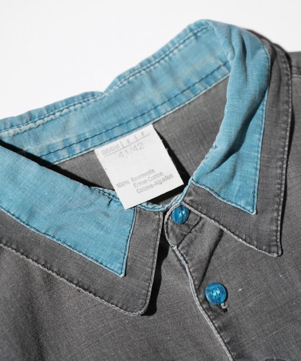 このシャツは特定のブランドタグが見当たらないため詳細は不明ですが、サイズ表記「41/42」から、ユーロサイズ表記を用いるヨーロッパ圏のブランド、またはその影響を受けた地域で製造された可能性が高いです。退色したグレーの色合いや独特のデザインから、1980年代以降のアイテムと推測されます。当時のカジュアルウェアは、既存のスタイルにとらわれない、遊び心のあるデザインが散見されました。