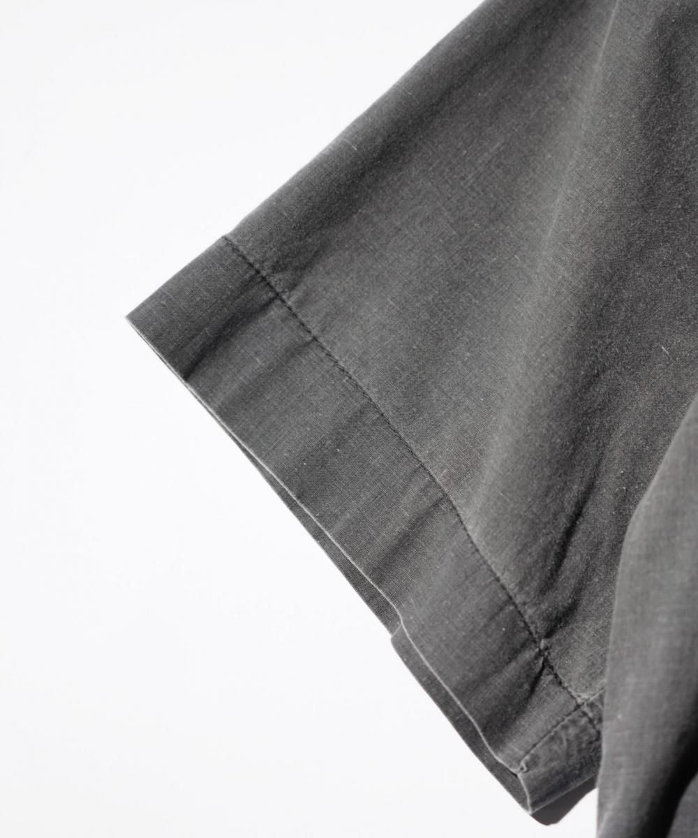 このヴィンテージ半袖シャツは、レギュラーカラーでありながら、襟の内側に鮮やかなターコイズブルーの生地が施されているのが特徴的です。全体的に色落ち感のあるグレーの生地に対し、ターコイズブルーのコントラストが目を引きます。前立て部分には、縦に並んだボタンホールの間に、変形型の小さなポケットのようなディテールが見られます。胸元には丸みを帯びたフラップポケットが付いており、こちらもターコイズブルーとピンクの生地で縁取られています。独特のカラーリングとディテールが、他にはない個性的な雰囲気を醸し出す一枚です。