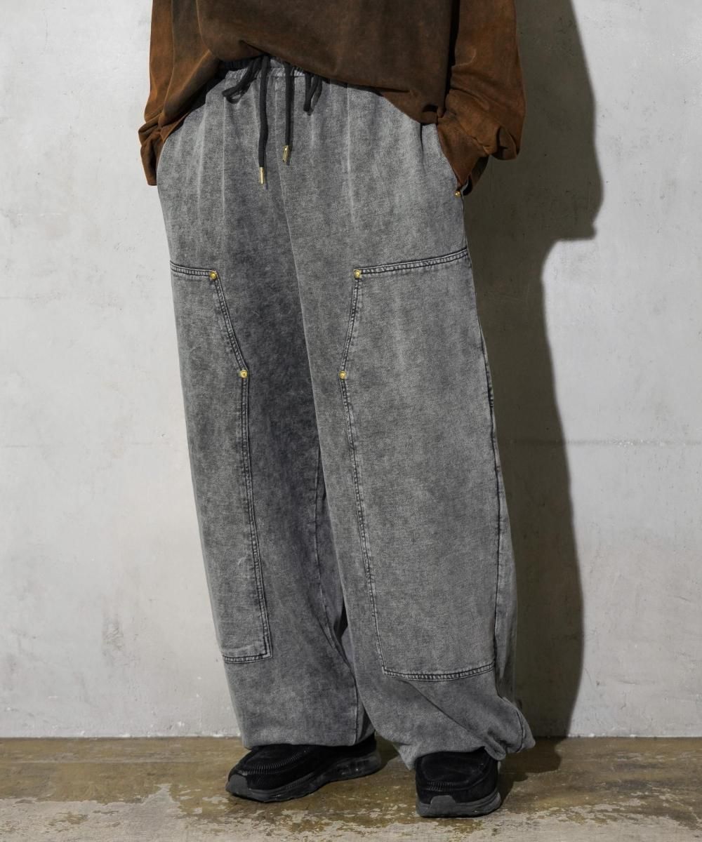 ワークアイテムとして知られるダブルニーパンツのディテールをワイドスウェットに落とし込んだデザインが特徴。
