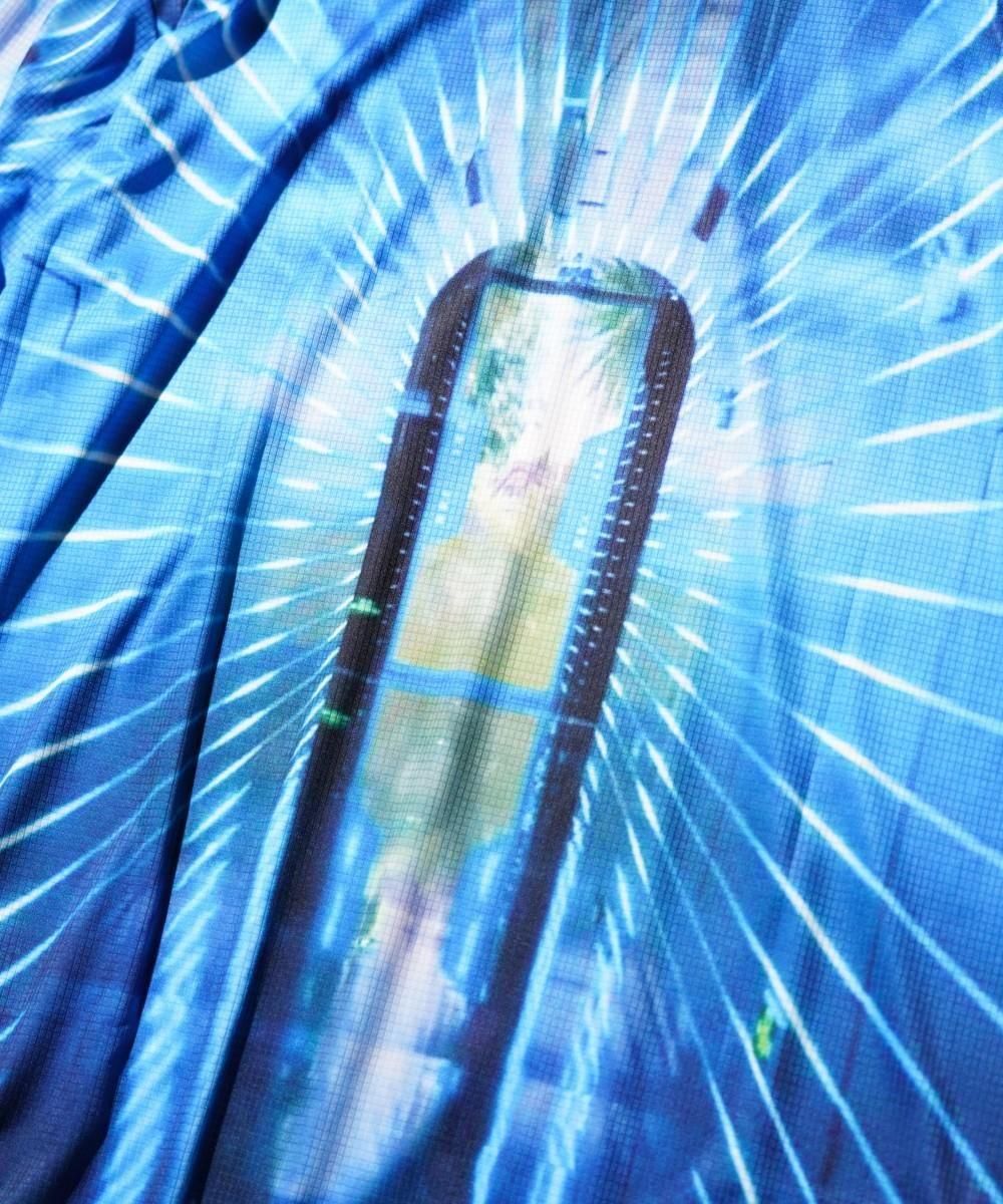 ライトウェイトでスポーティーなワッフルライクなポリエステル素材に、フルグラフィックプリントを施しました。