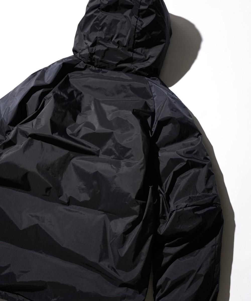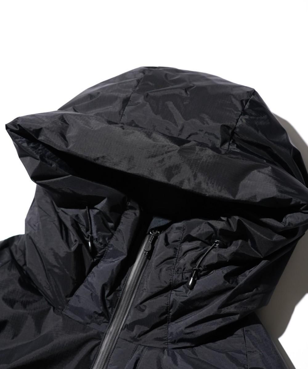 ・ネックまで覆う高めのフードは首元を暖かくキープし、ドローコードで調整可能です。