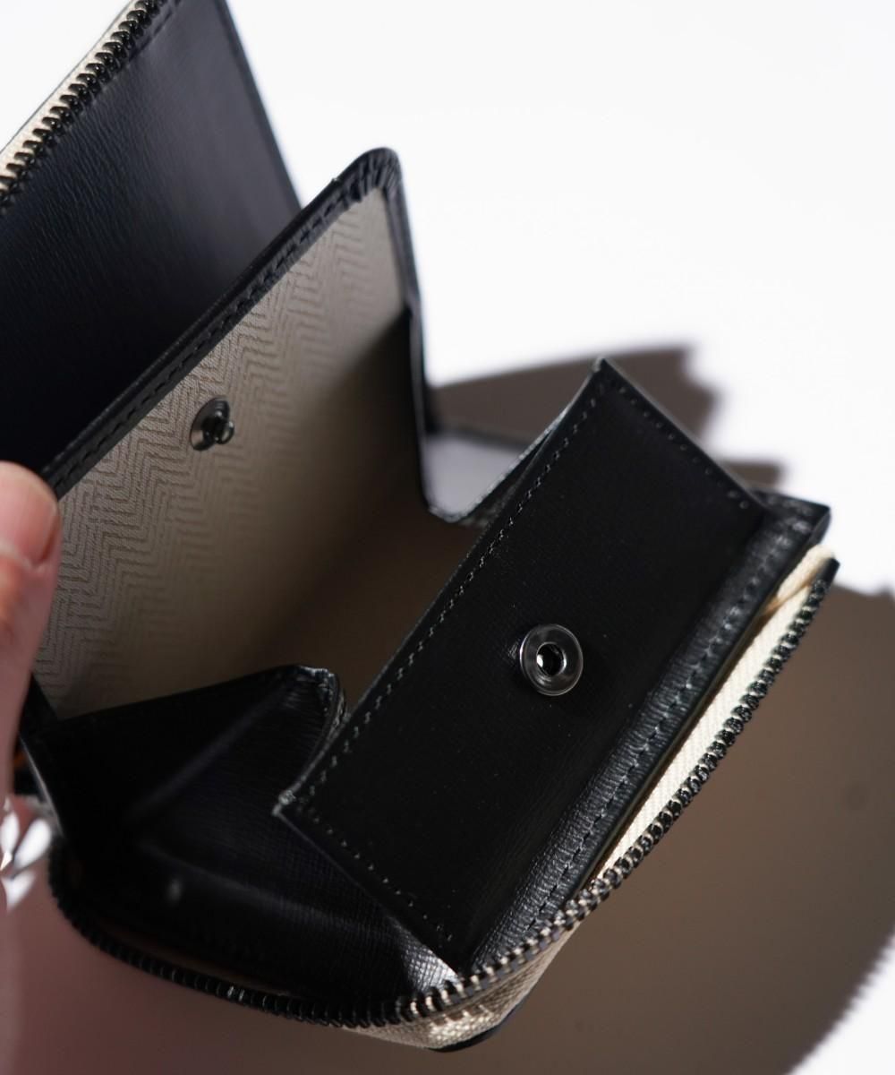 L字ファスナー仕様の二つ折りデザインで、手軽に収納できるコンパクトなボディが特徴。