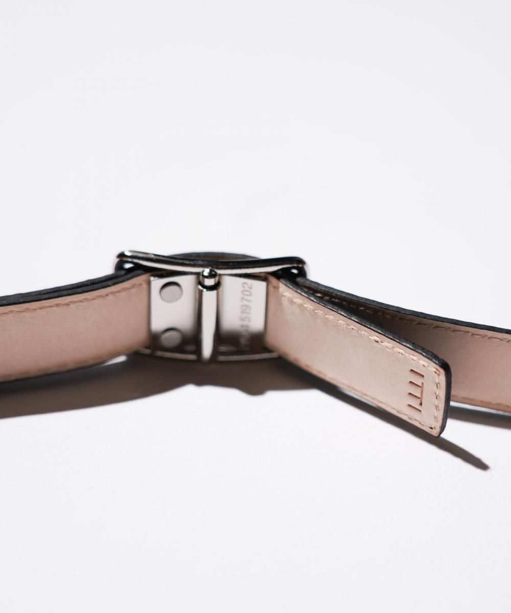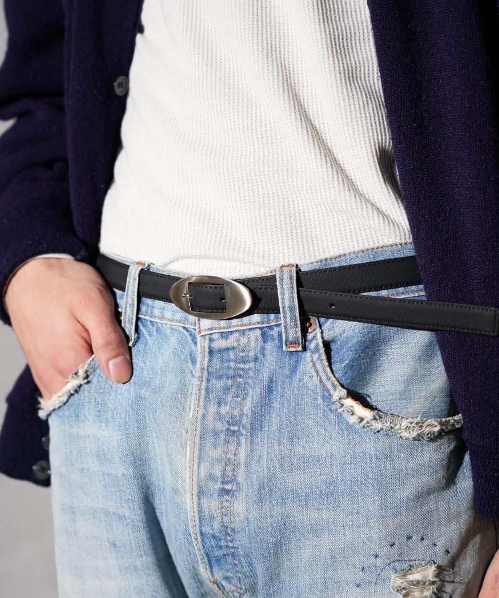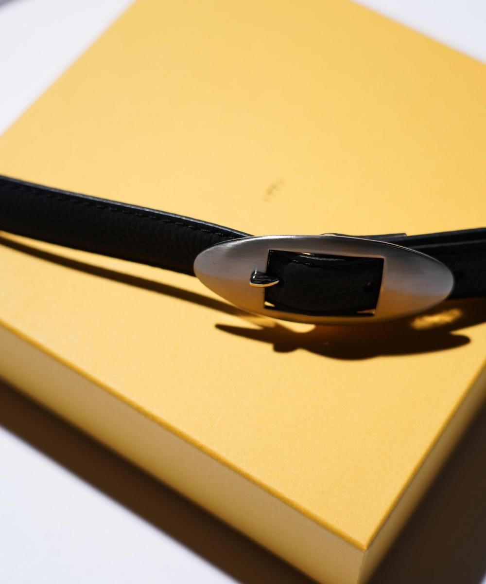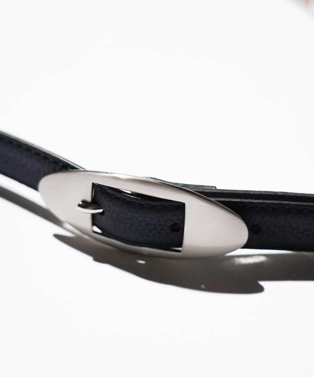 革の摩擦抵抗を活かして固定する振り子型バックルと、楕円形のミニマルなピンバックルを両端に備えた、二面性を持つフリーサイズベルトです。