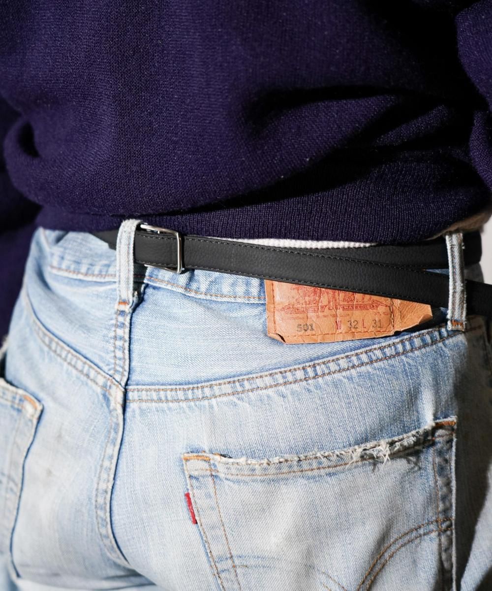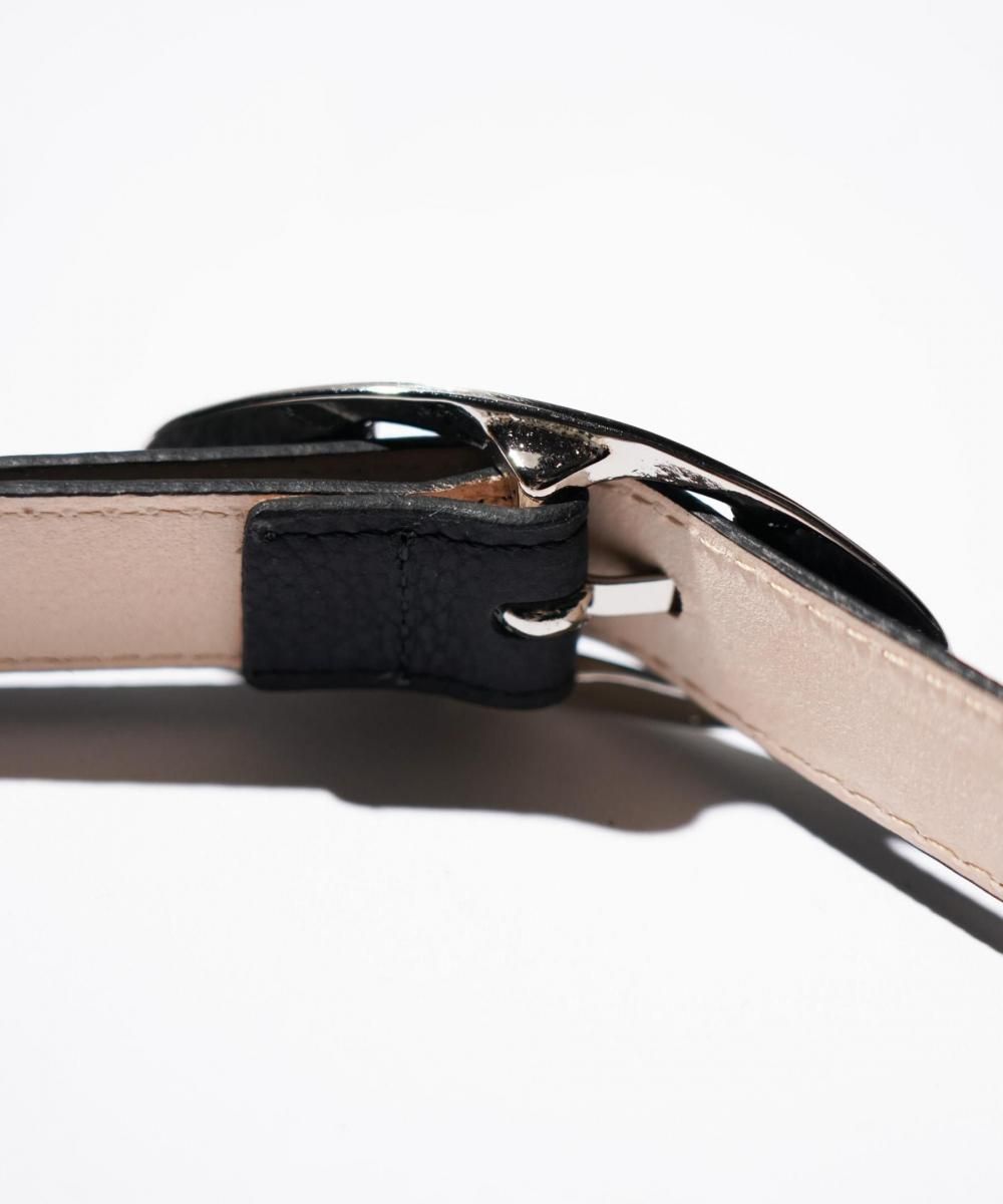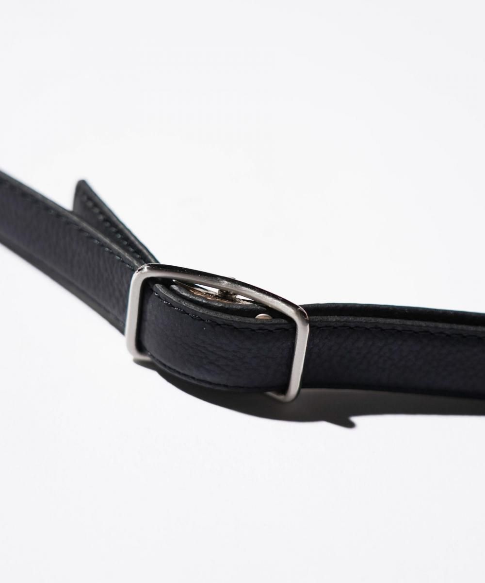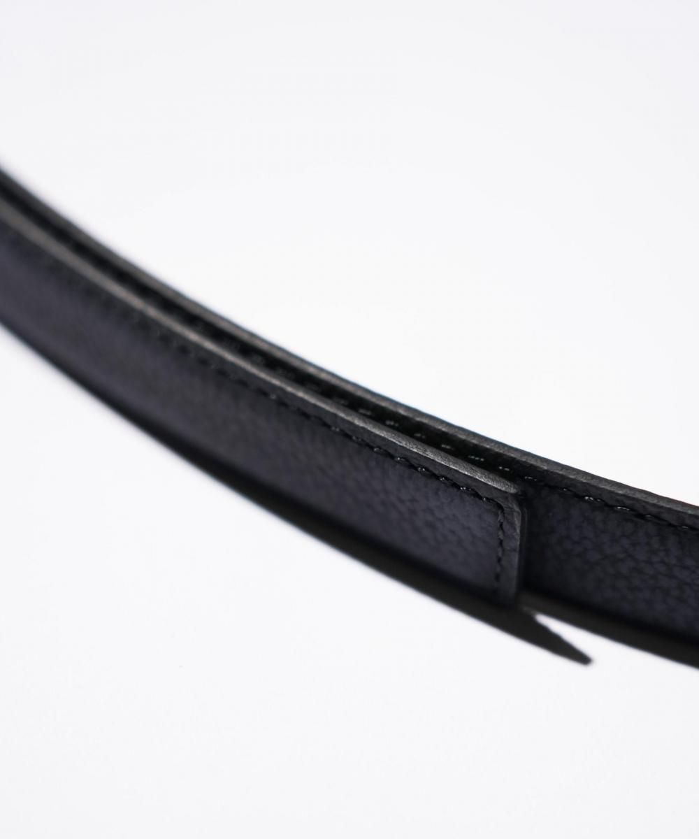 革の摩擦抵抗を活かして固定する振り子型バックルと、楕円形のミニマルなピンバックルを両端に備えた、二面性を持つフリーサイズベルトです。